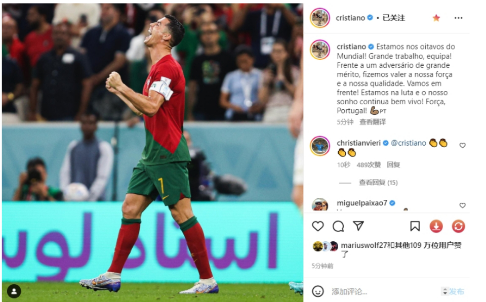 赛后,C罗发ins表示:“我们进入了世界杯16强!干得好,团队! 面对功勋卓著的对手,我们彰显了自己的实力。我们继续前进!我们在战斗,我们的梦想仍在!加油,葡萄牙!”