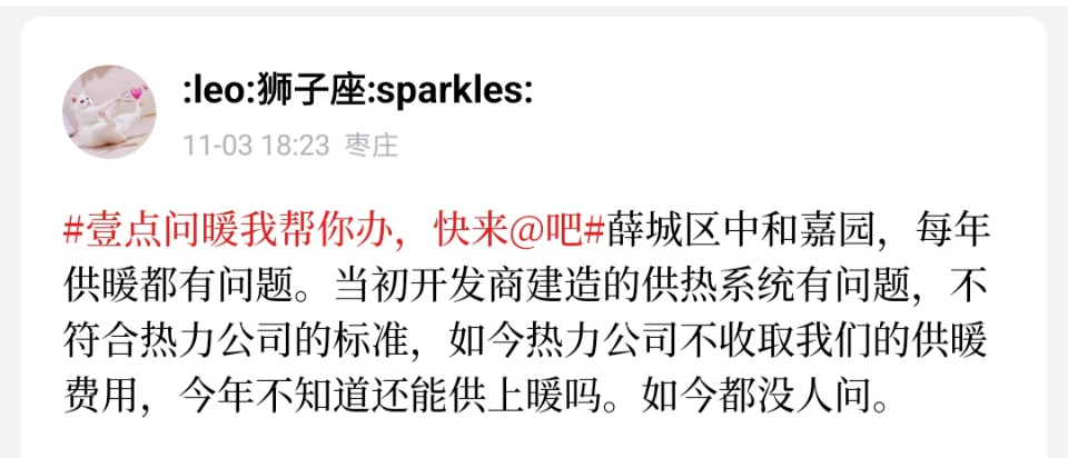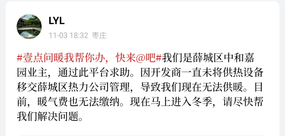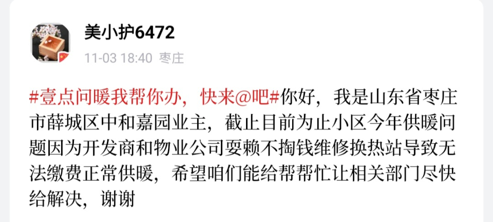 “我们小区,今年不知道还能供上暖吗?”壹粉“狮子座”留言道。随后,记者联系了薛城区鸿阳热力有限公司,供热相关科室宋主任就中和嘉园小区这一问题进行了解释,“开发建设单位未在我公司注水试压时下达的供热设施整改期限内完成整改,目前不具备供暖条件。”