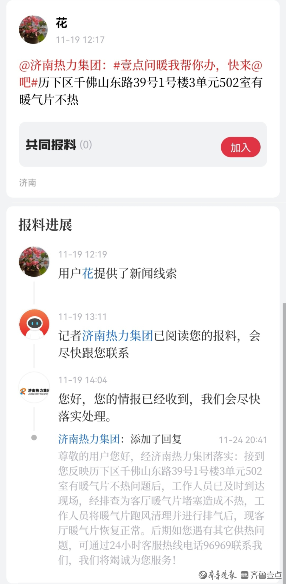 供暖有问题,壹点帮您办!如果您也有供暖困扰,您可以通过以下渠道方式告诉我们,记者将持续关注并跟进。齐鲁晚报·齐鲁壹点问暖帮办记者也会和热企一起深入各个小区和供热单位,协调供热主管部门,以图文、视频、直播等形式对供热期间遇到的各种问题进行全方位立体报道。