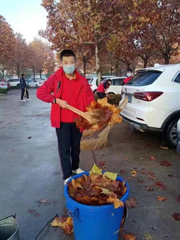 来到学校主路南边,花园和教学楼之间,我看到了感人的一幕。一大堆黄叶周围是一圈冒着汗的学生,脸上汗水涔涔,发梢冒着热气。一个同学用扫帚把树叶扫进簸箕,没有簸箕的同学就下了把,伸出两手,宽宽的放下,生怕抱少了,两手抱起冰凉的湿漉漉的树叶放进垃圾桶里,一抱一抱的,袖子湿了,衣服湿了,汗却出来了,富含胶原蛋白的青春的笑脸红红的。在家里也没干过这样的活啊,这些甜水里长大的孩子!他们的家长如果看到这一幕肯定会心疼的,不,一定会感到欣慰的。在学校里这个育人的大环境里,孩子们是绽放的自我的天性的。因为这不是在打扫卫生,这是在洗涤心灵,锻造更好的自己。今天扫校园,明天会扫更大的地方,不是吗?
