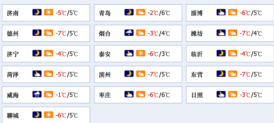 最低气温:菏泽、济宁和沿海地区-5℃左右,其他地区-7℃左右。 最高气温:鲁中山区和半岛内陆地区2℃左右,其他地区4℃左右。
