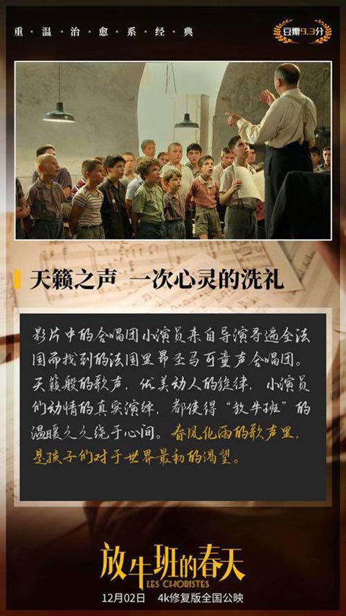 电影《放牛班的春天》将于12月2日上映。这部豆瓣评分高达9.3分的治愈系“人生必看”电影,时隔18年后终于和国内影迷相见。电影经4K技术修复的版本焕然新生,带来前所未有的视听震撼。关于在“池塘之底”马修老师用音乐感化问题学生的人生故事,引发了无数网友的集体回忆杀。