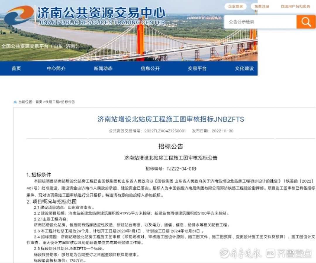招标公告显示,济南站新建北站房建筑面积按41995平方米控制;新建站台雨棚建筑面积按5100平方米控制。主要工程内容包括既有站房适应性改造,新建站台雨棚,以及电力、通信、信息、给排水等相关配套工程。工程计划总工期为24个月,计划开工日期2023年1月1日 ,计划竣工日期 2024年12月31日。