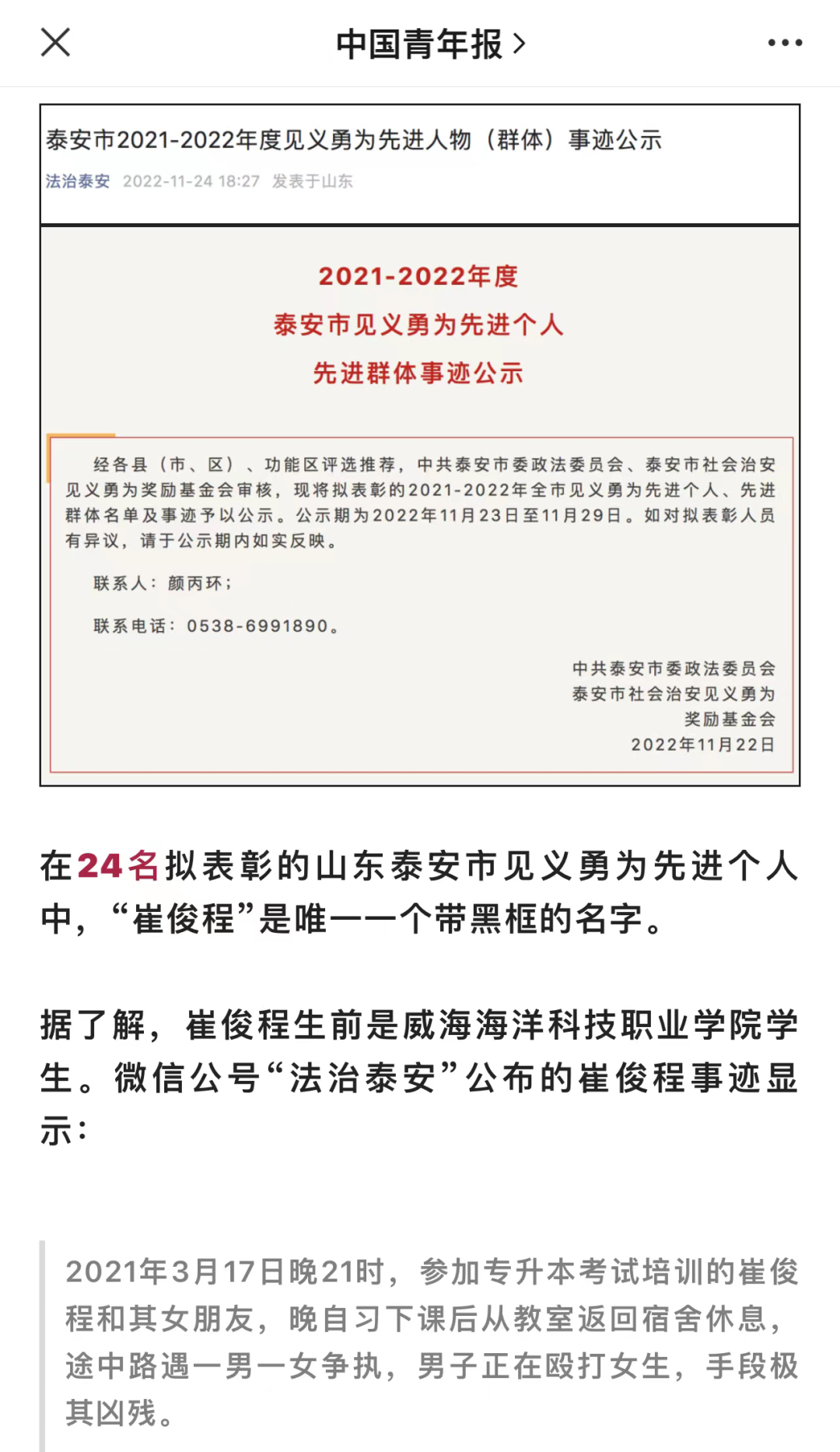 据中国青年报、北京青年报报道,泰安崔先生在自媒体讲述儿子遇害时说,“看到有人殴打女性,儿子凭着善良的本性上前制止,没想到酿成了一场悲剧。”