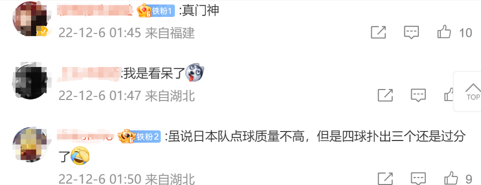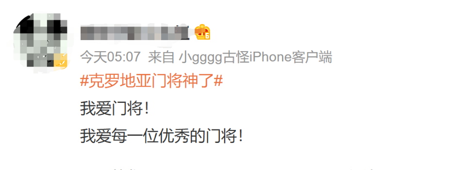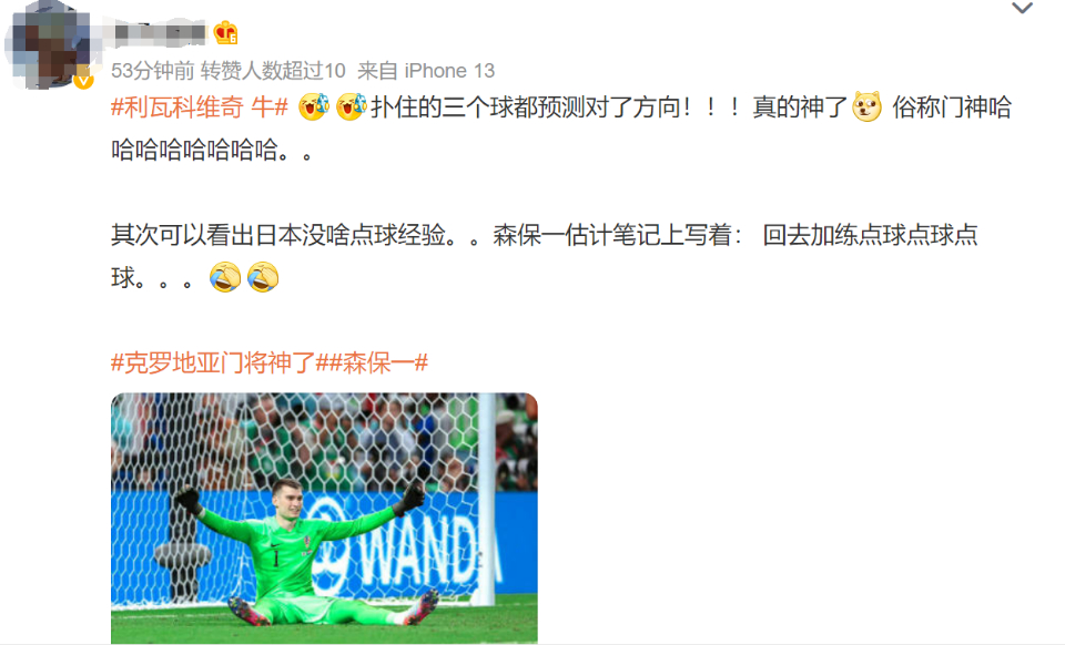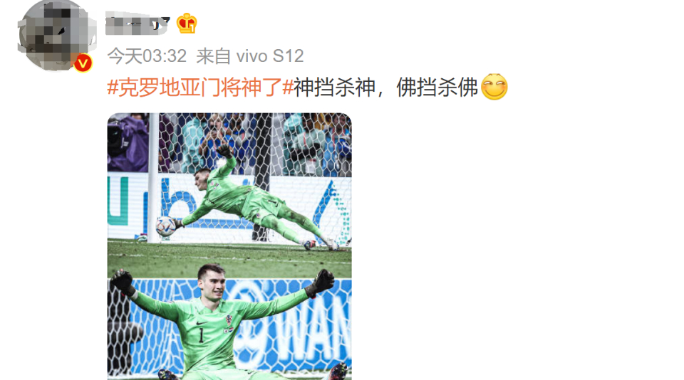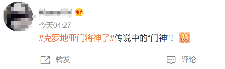 对于克罗地亚门将利瓦科维奇扑点四中三的神奇表现,网友纷纷评价:门神、神了、封神、太牛了