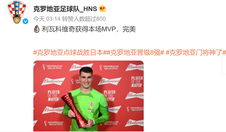 FIFA世界杯官方把本场比赛的最佳球员,颁发给了三扑点的利瓦科维奇获。