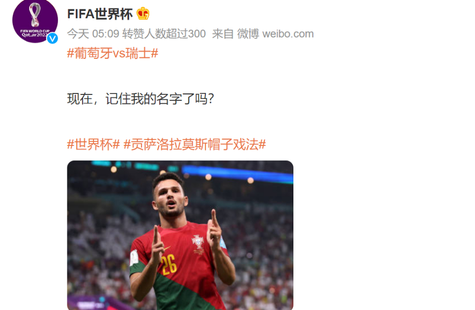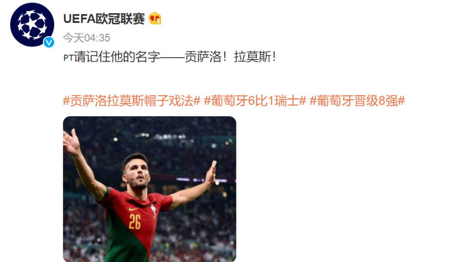 UEFA欧洲冠军联赛官方微博:请记住他的名字——贡萨洛!拉莫斯!