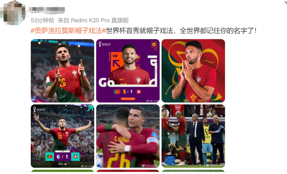 在上演帽子戏法后,贡萨洛·拉莫斯将目标瞄准了下一场比赛,赛后发文表示:“魔幻的夜晚,让我们四分之一决赛加油吧!葡萄牙!”