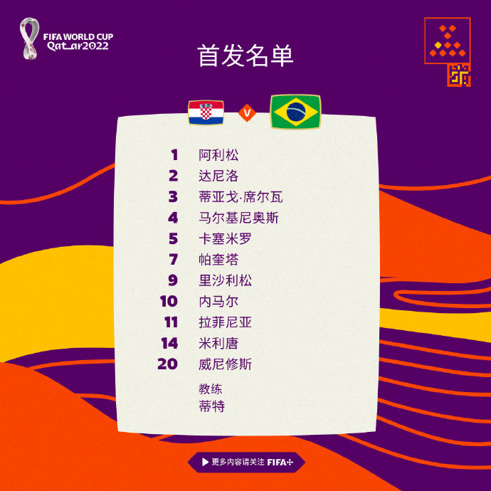 巴西首发名单:1-阿利松、2-达尼洛、3-蒂亚戈·席尔瓦、4-马尔基尼奥斯、14-米利唐、5-卡塞米罗、7-帕奎塔、20-威尼修斯、10-内马尔、11-拉菲尼亚、9-里沙利松