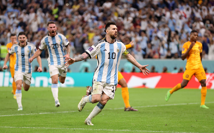 本场比赛,第35分钟,梅西送出绝妙助攻,莫利纳进球,阿根廷1:0领先。第73分钟,阿根廷获得点球,梅西主罚命中,阿根廷2:0领先。这是梅西在世界杯上的第10粒进球,追平巴蒂斯图塔,并列阿根廷队史第一。第83分钟,韦霍斯特头球破门,荷兰扳回一球。伤停补时最后一刻,荷兰巧妙任意球配合,韦霍斯特再进一球,荷兰2:2绝平阿根廷,进入加时赛。加时赛中,双方都没有再进球,进入点球大战。点球大战,阿根廷门将马丁内斯两扑点球,阿根廷4-3战胜荷兰,惊险晋级四强。