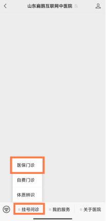 1.在公众号菜单栏中点击【挂号问诊】、【医保问诊】。