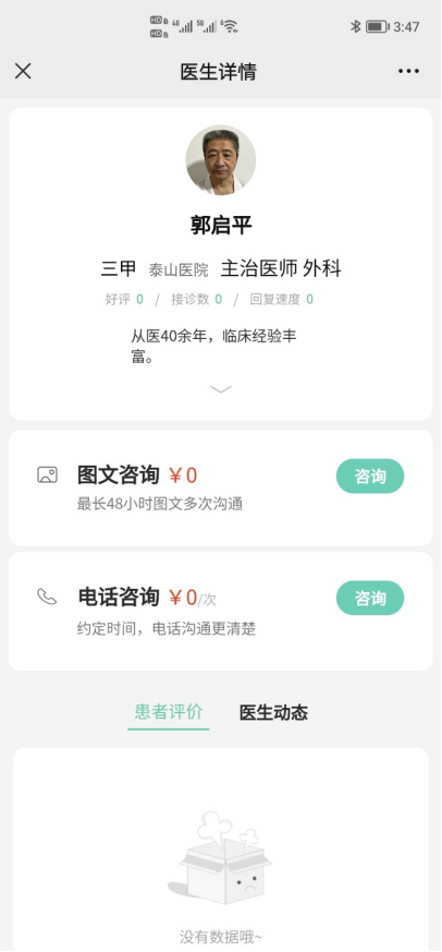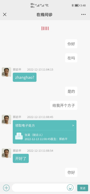 6.点击确定按钮,进入与医生聊天页面,医生在这里与用户图文沟通,并开处方。