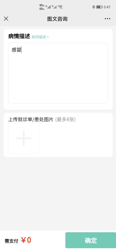 5.进入医生详情页后点击”图文咨询”后面的咨询按钮,进入提交症状页面,在这里用户可以描述下自己的症状及上传检查报告。