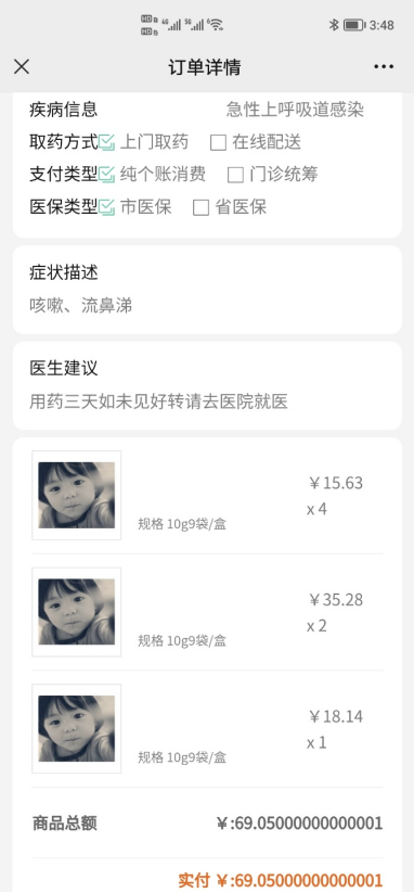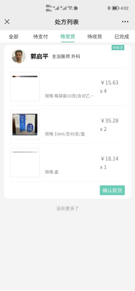 7:点击医生开的处方,进入结算页面,用户可以选择取药方式,支付类型,然后点击确定。