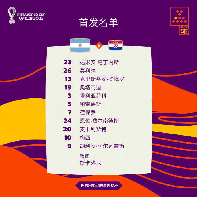 阿根廷首发名单:23-达米安·马丁内斯、26-莫利纳、13-克里斯蒂安·罗梅罗、19-奥塔门迪、3-塔利亚菲科、5-帕雷德斯、7-德保罗、24-恩佐·费尔南德斯、20-麦卡利斯特、10-梅西、9-胡利安·阿尔瓦雷斯