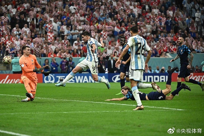 第39分钟,阿根廷队发动进攻,胡利安·阿尔瓦雷斯长途奔袭,一条龙破门。阿根廷2:0领先克罗地亚。