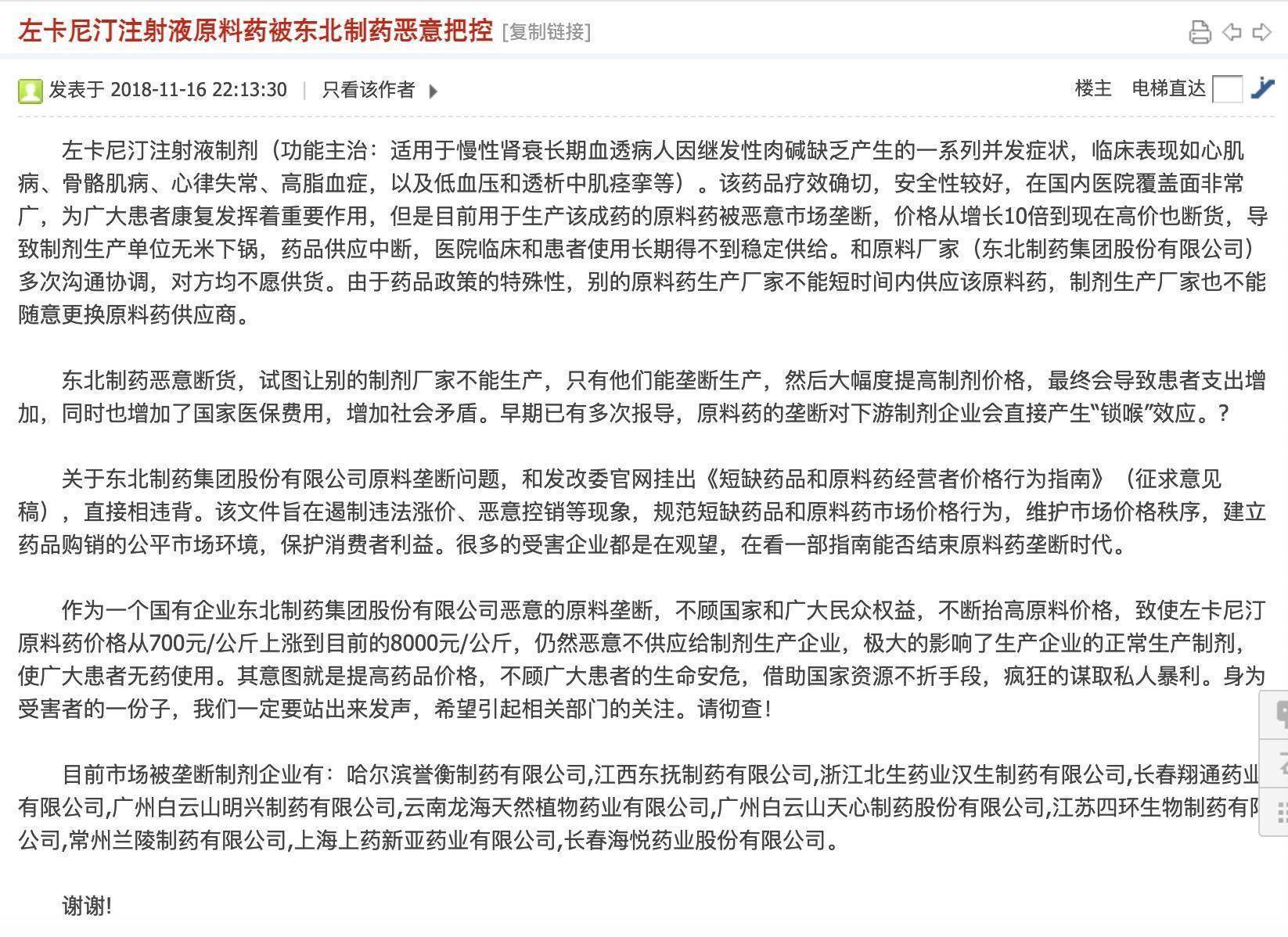 南都记者注意到,早在2018年11月,一封关于东北制药垄断左卡尼汀原料药的举报信就曾在网上流传。