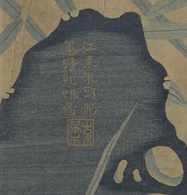 朱克柔缂丝《莲塘乳鸭图》(局部),“江东朱刚制莲塘乳鸭图”款