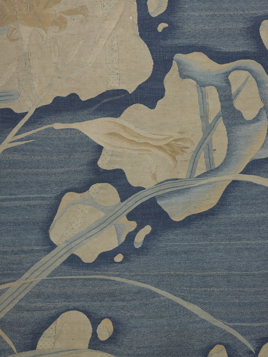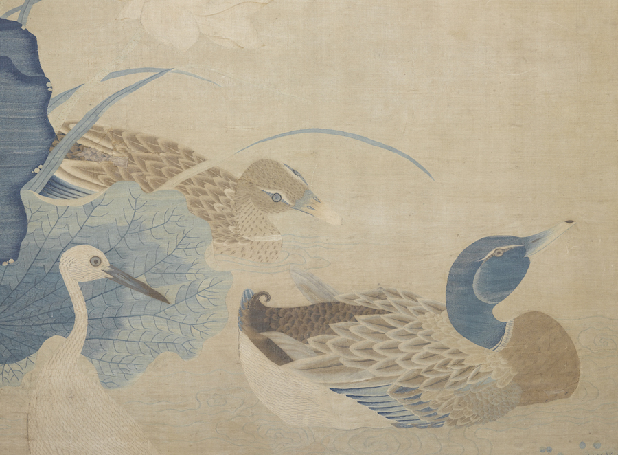 朱克柔缂丝《莲塘乳鸭图》(局部),画面顶部