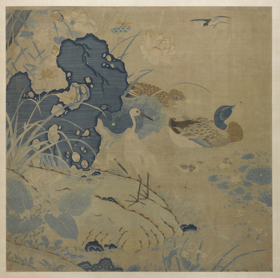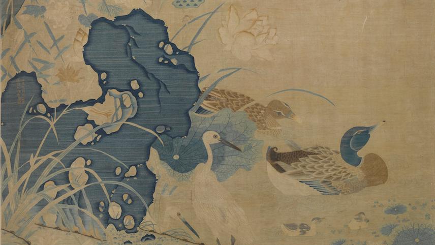 于颖:作品中绿头双鸭浮游于萍草间,尾有乳鸭相随,旁有白鹭一对,翠鸟、红蜻蜓和水黾点缀其间。从题材上表现的是富贵吉祥,成双成对。但从画面上部的没有成对的部分推测,这件作品可能还未完成或逸散了一部分。