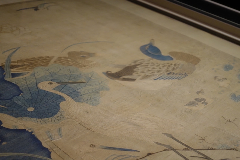 而这一次,则是在上博建馆七十周年之际,在这个有意义的时间点,把国宝朱克柔缂丝《莲塘乳鸭图》拿出来供大家赏析。此前,国家宝藏节目对《莲塘乳鸭图》做了故事的演绎,引起广泛关注,令全世界的人都惊叹这一织造技术所做出的难以辨认的绘画效果。这一效果甚至是比绘画更具有一种意犹未尽的体验,因为它有丝丝光泽,而绘画中没有这种丝绸光泽的变化。缂丝作品的颜色会随着欣赏角度的变化、光照强弱的变化而变化,以此更接近人们的肉眼所看到的真实生态环境下的肌理,这也是在欣赏角度上,缂丝和绘画最大的区别。