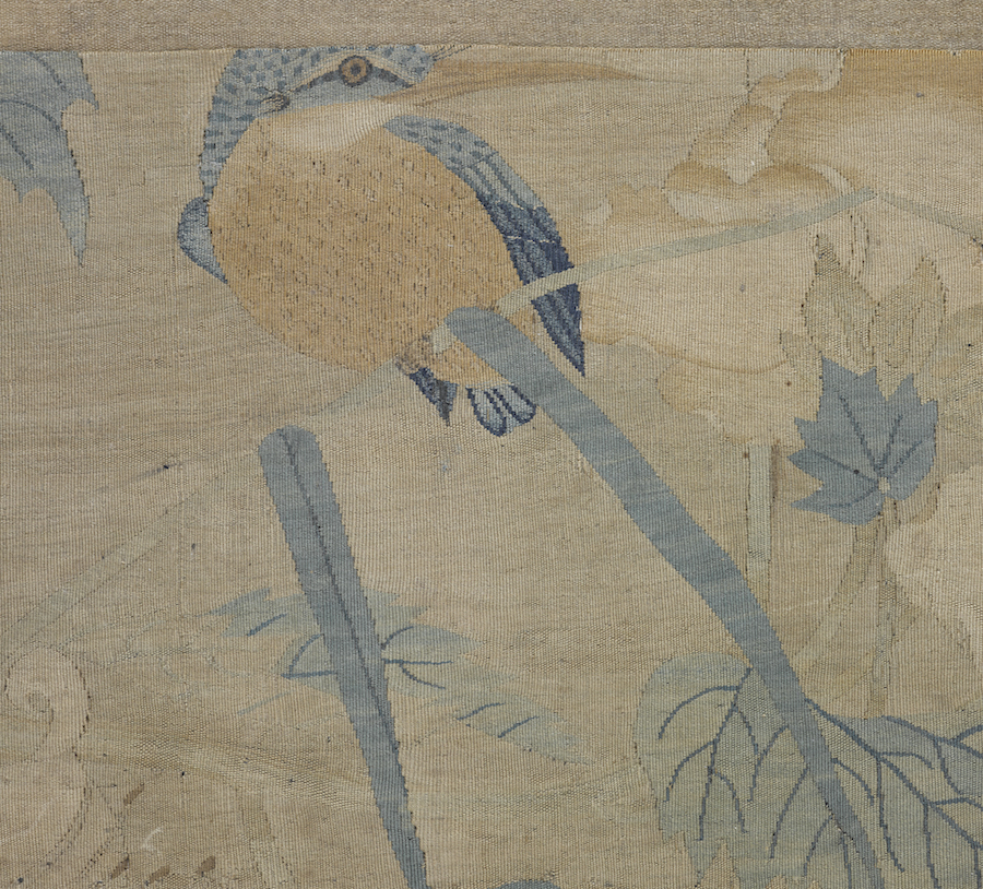 于颖:这件作品肯定是有过褪色的,底色因为纤维蛋白老化引起泛黄,加深;红色部分因为是植物染料,对氧气和光的敏感度较高,所以是较早出现褪色的现象;绿颜色的部分也会泛黄,没有原来那么鲜绿;石青部分也是。所以可以想像,整幅作品过去的颜色会更鲜亮。