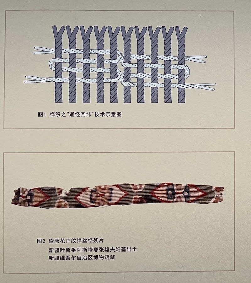展览现场,(上)“通经回纬”技术示意图,(下)盛唐花卉纹缂丝残片