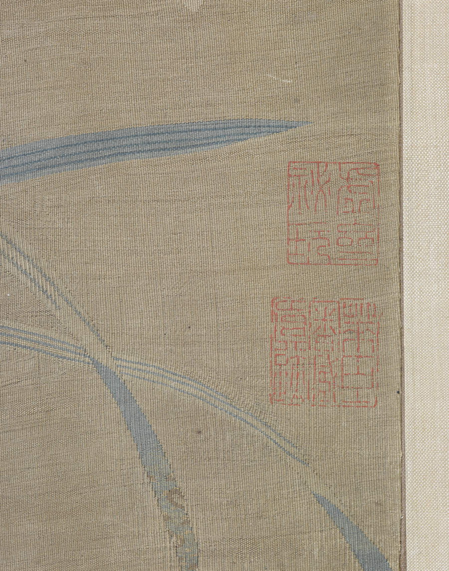 朱克柔缂丝《莲塘乳鸭图》(局部),钤“虚斋秘玩”、“莱臣审藏真迹”