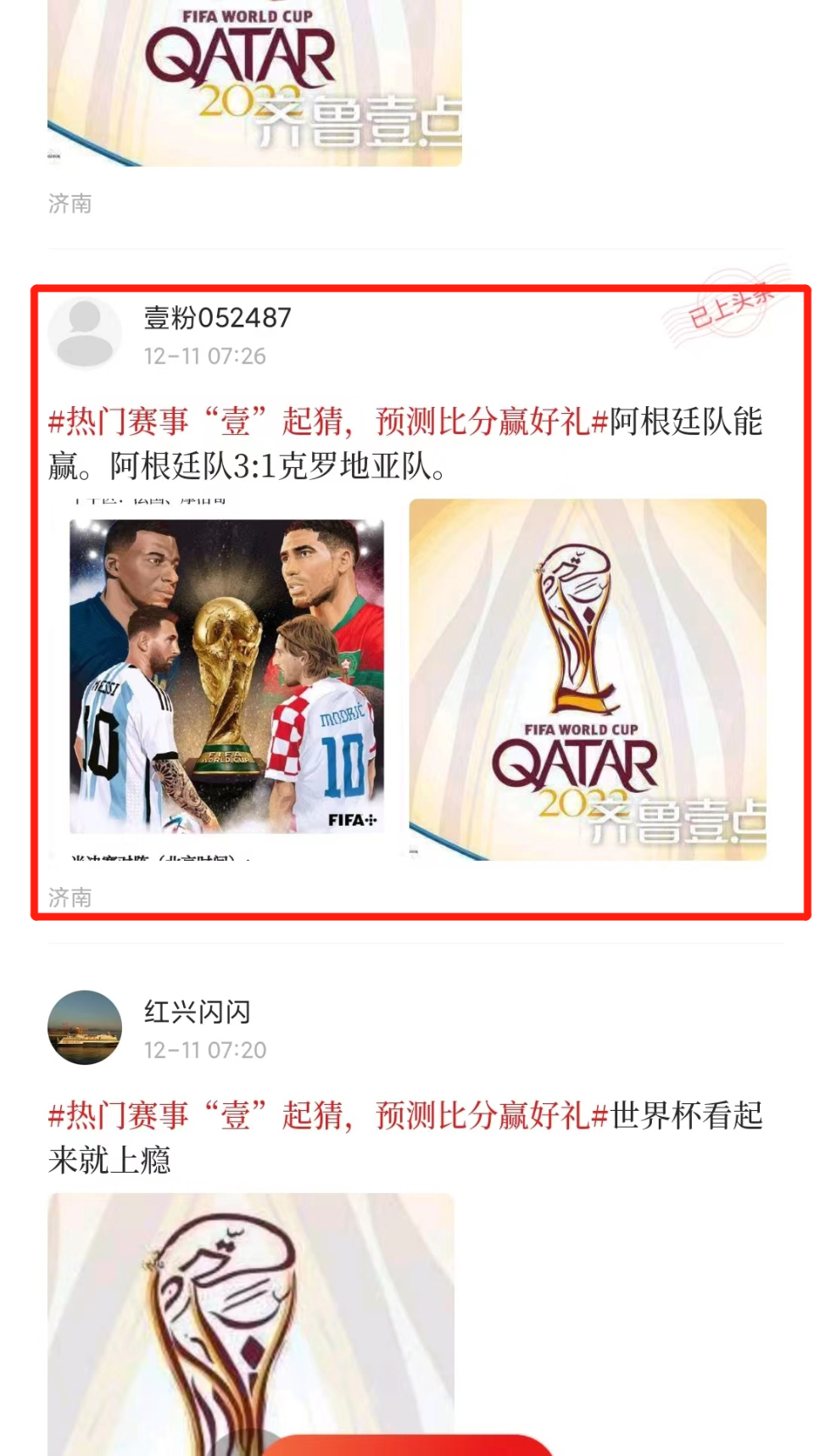 北京时间12月17日23:00,卡塔尔世界杯季军争霸赛即将打响!12月14日,齐鲁晚报·齐鲁壹点第十八场竞猜互动关注阿根廷VS克罗地亚的比赛。上半场,梅西点球破门,打进个人本届世界杯第五球,追平姆巴佩,并列射手榜第一。阿根廷队阿尔瓦雷斯单刀破门扩大比分。下半场,梅西助攻,阿尔瓦雷斯独中两元。最终,克罗地亚不敌阿根廷无缘世界杯决赛,阿根廷3:0完胜克罗地亚,率先晋级决赛。大比分的差距让壹粉们“全军覆没”,根据有奖竞猜活动规则,济南壹粉“052487”预测比分最为接近成为本轮竞猜互动的获奖者!