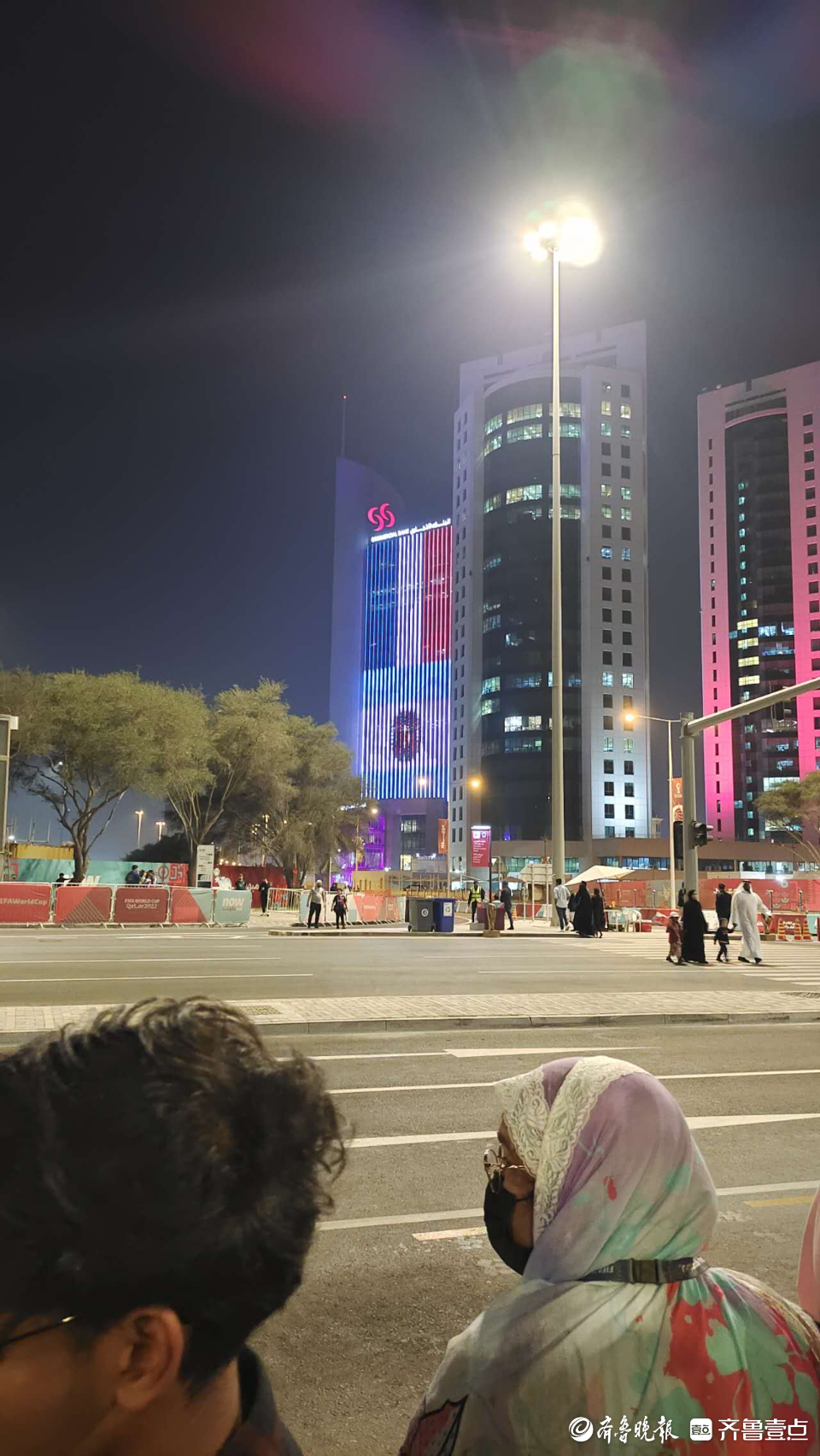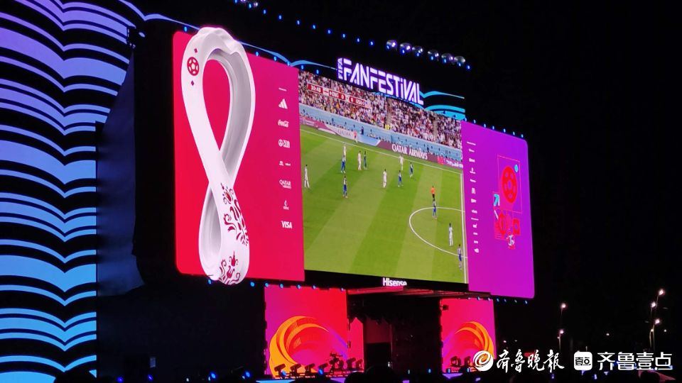 球迷公园位于多哈市中心。向北望去,就是多哈高楼建筑群。环视周边,这里的世界杯氛围非常浓厚。一幢高楼的外墙屏幕上,显示着比赛当天的对阵信息,以及决赛倒计时。比赛开始时,它又变成了一个巨大的比分牌。