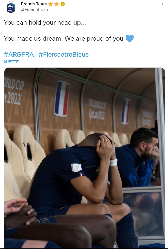 赛后,法国队官推发文鼓励姆巴佩:你可以抬起头来……你让我们继续梦想,我们以你为荣!