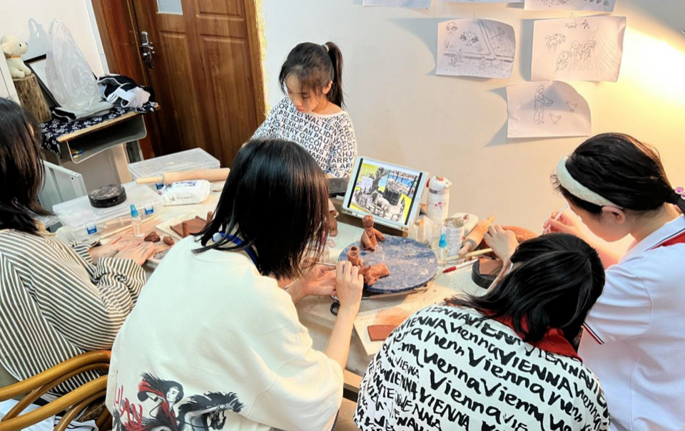 在开设超轻粘土社团的同时,我们美术组的老师努力找寻合适的场地制作陶艺,我们改变了传统的坐在会议室中教研的方式,而选择在美术器材室中开展“沉浸式教研”,(沉浸式教研意为以陶艺为主题,老师们手里一边制作陶艺,一边解决在日常教学中出现的问题)在实践的过程中,我们一致认为手捏陶艺更适合小学生的认知特点和手脑协调能力。而相应的泥料便是陶泥,陶泥已成型且不易开裂的特点更适合孩子们进行操作。
