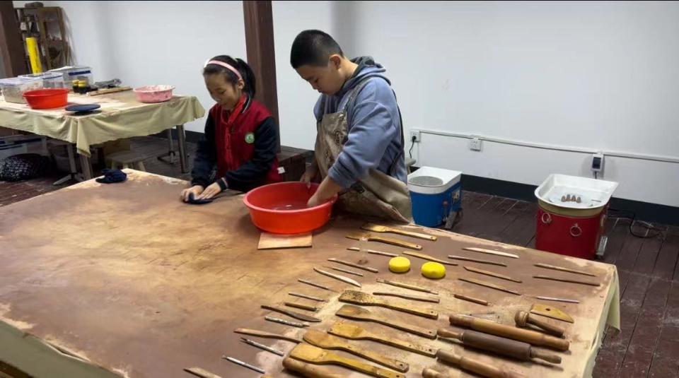 其实陶艺制作的过程也是劳动的过程,每次完成作品后,孩子们都会自觉分工,认真地把工具清洗干净,整整齐齐地把工具摆在桌面上。