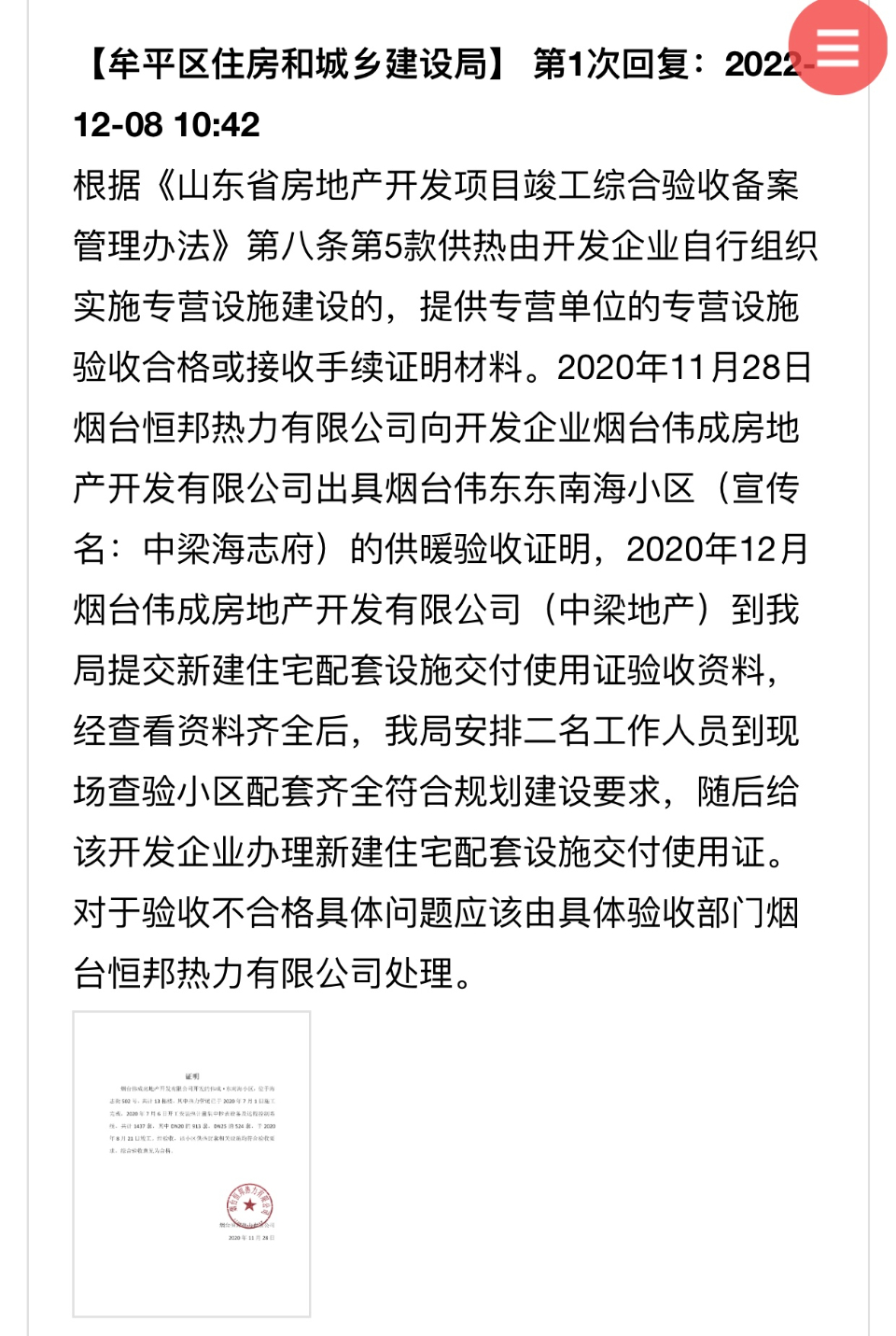 中梁海志府业主常女士说,热力公司12月5日出具了一份供暖设施不合格的整改通知,业主们便在网络问政平台上发帖提出疑问,为什么供暖设施验收不合格的小区也能交付房屋。12月8日,牟平区住建局对此事进行了回复,并附上一份2020年11月28日,热力公司出具的供暖设施验收合格的证明。