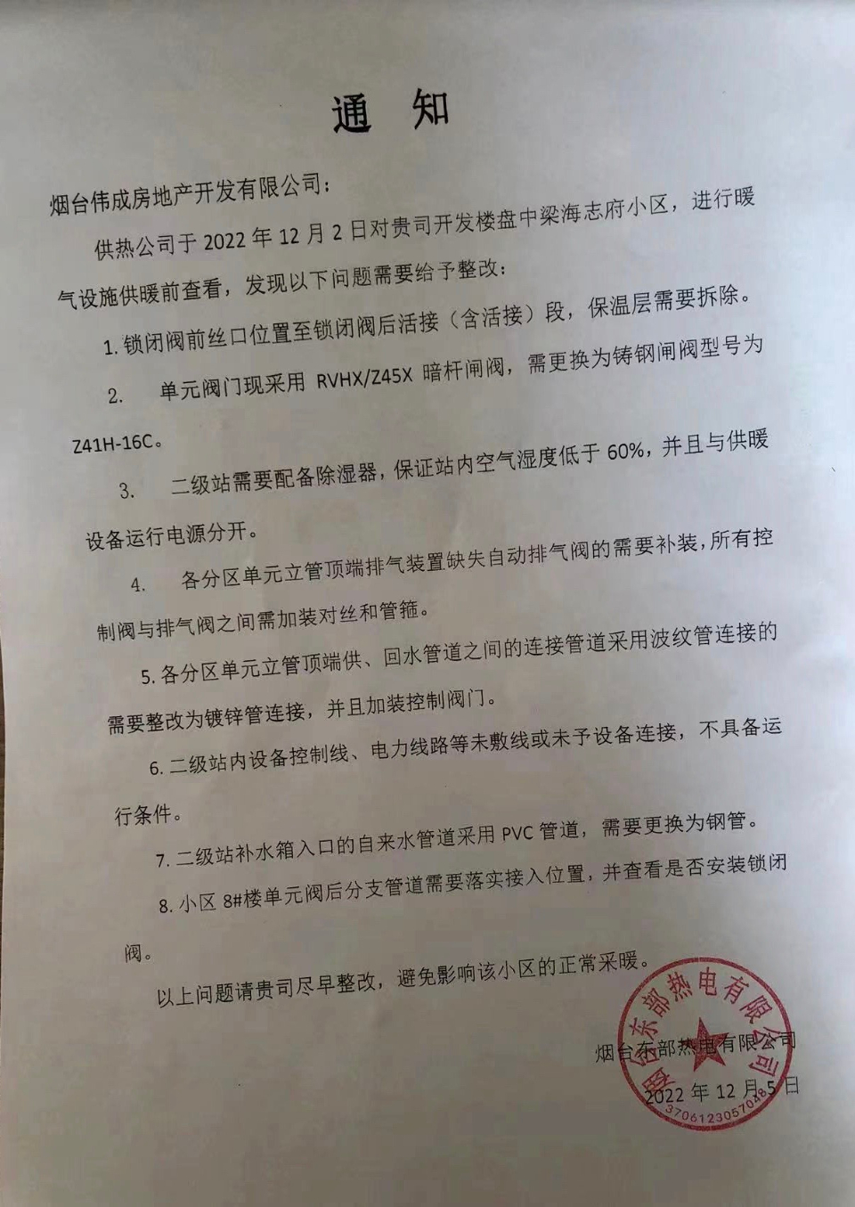 12月5日,烟台东部热电有限公司给中梁海志府小区出具一份供暖设施整改通知。