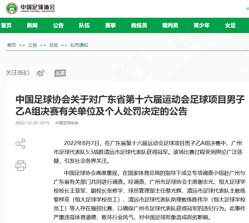 足协官方:暂停广州足协会员资格两年,对恒大足校通报批评