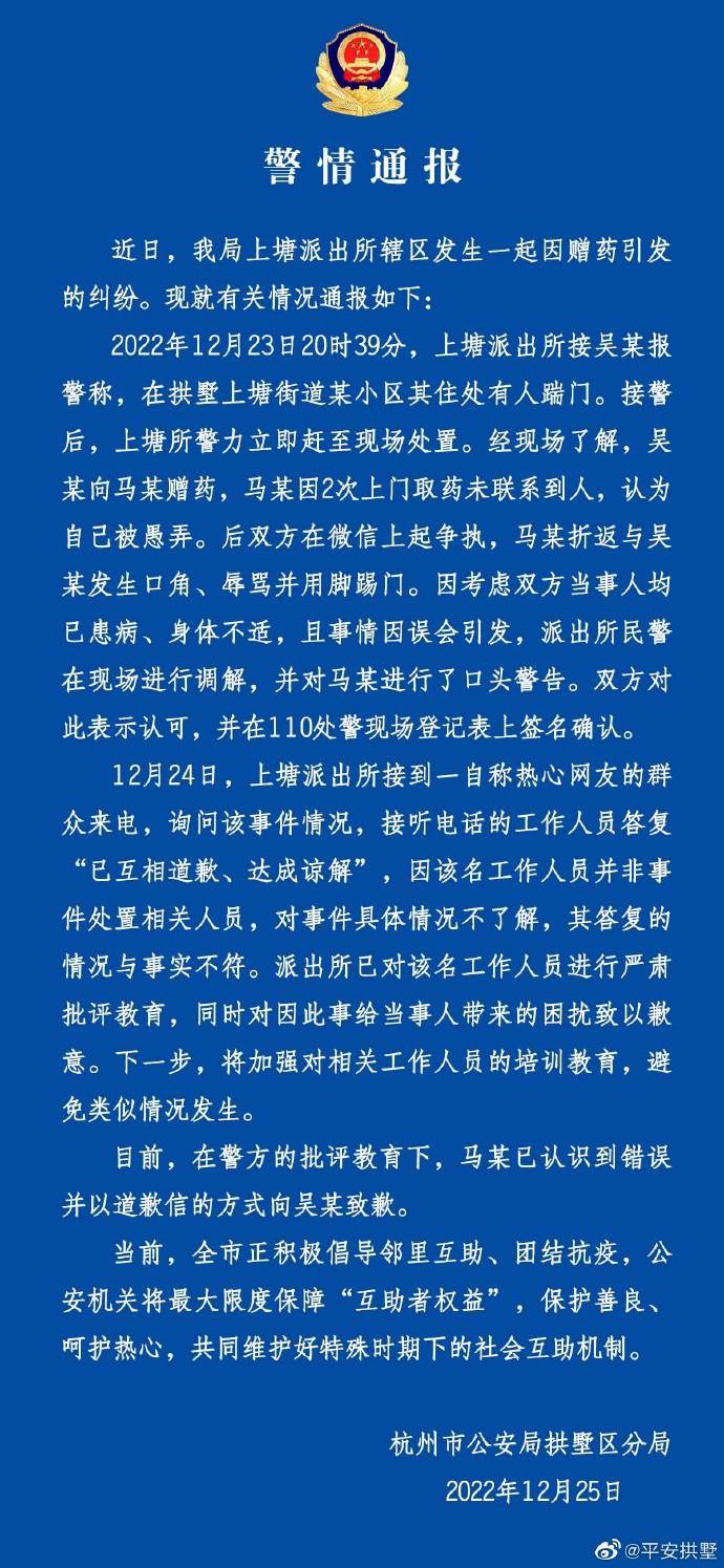 女子赠药遭踹门,警方通报:受赠方以道歉信方式向女子致歉