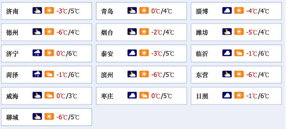 最低气温:鲁西北、鲁中山区和半岛内陆地区-6℃左右,沿海地区-1℃左右,其他地区-4℃左右。 最高气温:烟台北部、威海和鲁中山区2℃左右,其他地区5℃左右。