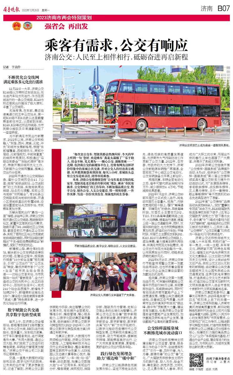 济南公交集团党委书记、董事长石军表示,2023年是实施“十四五”规划承上启下的关键一年,济南公交将积极融入济南市黄河流域高质量发展、新旧动能功能转换和新时代社会主义现代化强省会等重大战略,坚持以人民为中心的发展思想和“市民有需求、公交有响应”的工作导向,以推进数字化转型为主线,打造市民有感知的数字公交。以提高公交分担率为核心,构建吸引力强的高品质公交;以“公交+”体系框架为基础,打通出行全产业链,建设有活力的生活公交,为市民出行、为城市发展做出新的更大贡献。