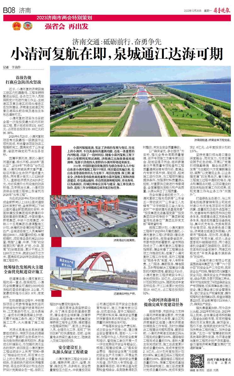小清河复航工程(济南段)建设进度全省领先。按照省委省政府、市委市政府部署要求,省市两级均成立了小清河复航工程建设指挥部,健全完善了工程建设各项工作推进机制。组建了小清河复航工程工作专班,实行工程建设“服务专员”制度,专人专职专责,上门服务、靠前服务、精准服务,及时帮助解决工程建设中遇到的问题和困难。在市指挥部各成员单位的共同努力下,小清河航道(济南段)全断面开挖基本完成,一级护坡完成94.3%;二级护坡完成91.1%;新建桥梁8座,其中4座已完工并通车,其余4座桥梁已基本完工,正在进行桥面沥青铺设。柴庄节制闸、2座倒虹吸已完工并投入使用,标志着小清河复航工程济南段实现主体工程完工的节点目标任务。截至12月15日,小清河复航工程济南段今年以来完成投资5.33亿元,占2022年计划投资的121%,提前完成年度目标任务;开工以来累计完成投资19.66亿元,占工程总投资的92%。