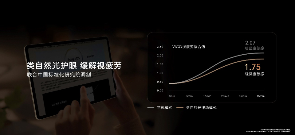 荣耀平板V8 Pro率先实现了行业首款144Hz自适应高刷屏幕,为用户提供了更丝滑的视觉体验。还搭载护眼黑科技“类自然光护眼”,可模拟自然光的动态变化,大幅降低因长时间观看产生的眼部疲劳感。通过了莱茵硬件级低蓝光,莱茵无频闪认证、国家眼科工程中心护眼认证以及中标院VICO A+视觉舒适度测试,荣耀平板在护眼领域再一次实现了突破。
