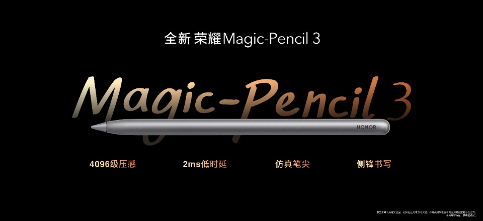 随荣耀平板V8 Pro一同推出的还有HONOR Magic-Pencil3手写笔,提供了迄今为止荣耀手写笔产品中最好的书写体验,4096级压感,时延体验低至2ms,零压出墨,可以更好的配合荣耀超级笔记功能进行批注。荣耀平板V8 Pro还搭载全新智能触控键盘使用,支持110°~160°多角度开合,拥有PC级键盘的1.6mm的键程,文字录入更高效。