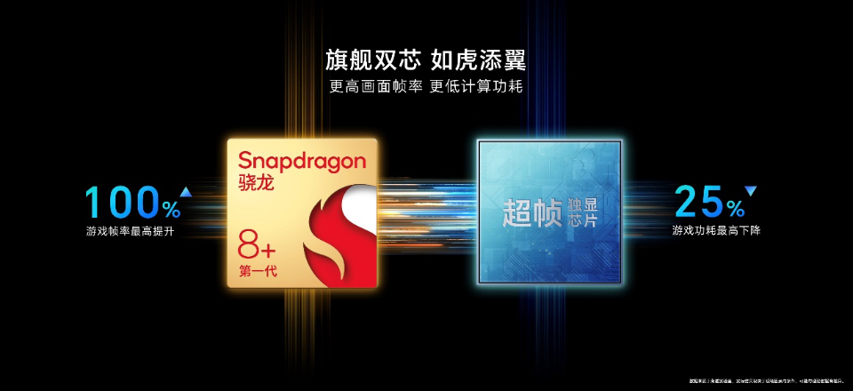 荣耀80 GT采用 “超帧双芯”的电竞级豪华配置,除了搭载高通骁龙8+旗舰芯片,荣耀80GT还搭载一颗超帧独显芯片,支持MEMC功能和实时HDR画面优化能力。相比单芯片,超帧双芯让荣耀80 GT游戏帧率最高提升100%,游戏功耗最高下降25%,为领先的游戏体验提供了良好的硬件基础。