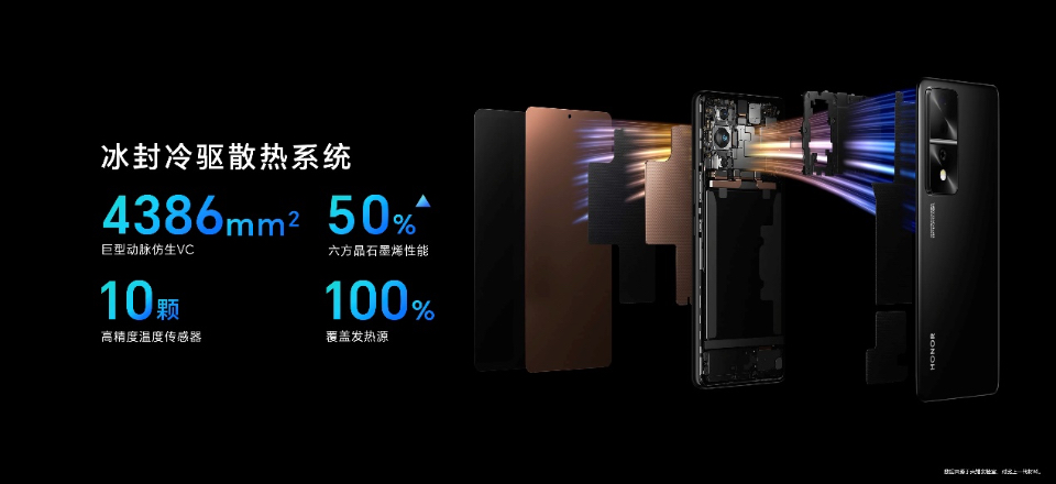 荣耀80 GT致力用科技想象力重构手机的散热架构,解决手机“厚度每减薄1mm,散热能力下降约9%”的行业难题。它采用全新的冰封冷驱散热系统,总散热面积达到34254mm²,几乎覆盖手机中100%的发热源,其中巨型动脉仿生VC面积达4386mm²,导热性能相比普通VC提升42.8%,配合超导六方晶石墨烯,以及10颗高精度的温度传感器,荣耀80GT在7.9mm、187g的轻薄机身下,带来了性能更强、温度更低的游戏体验。