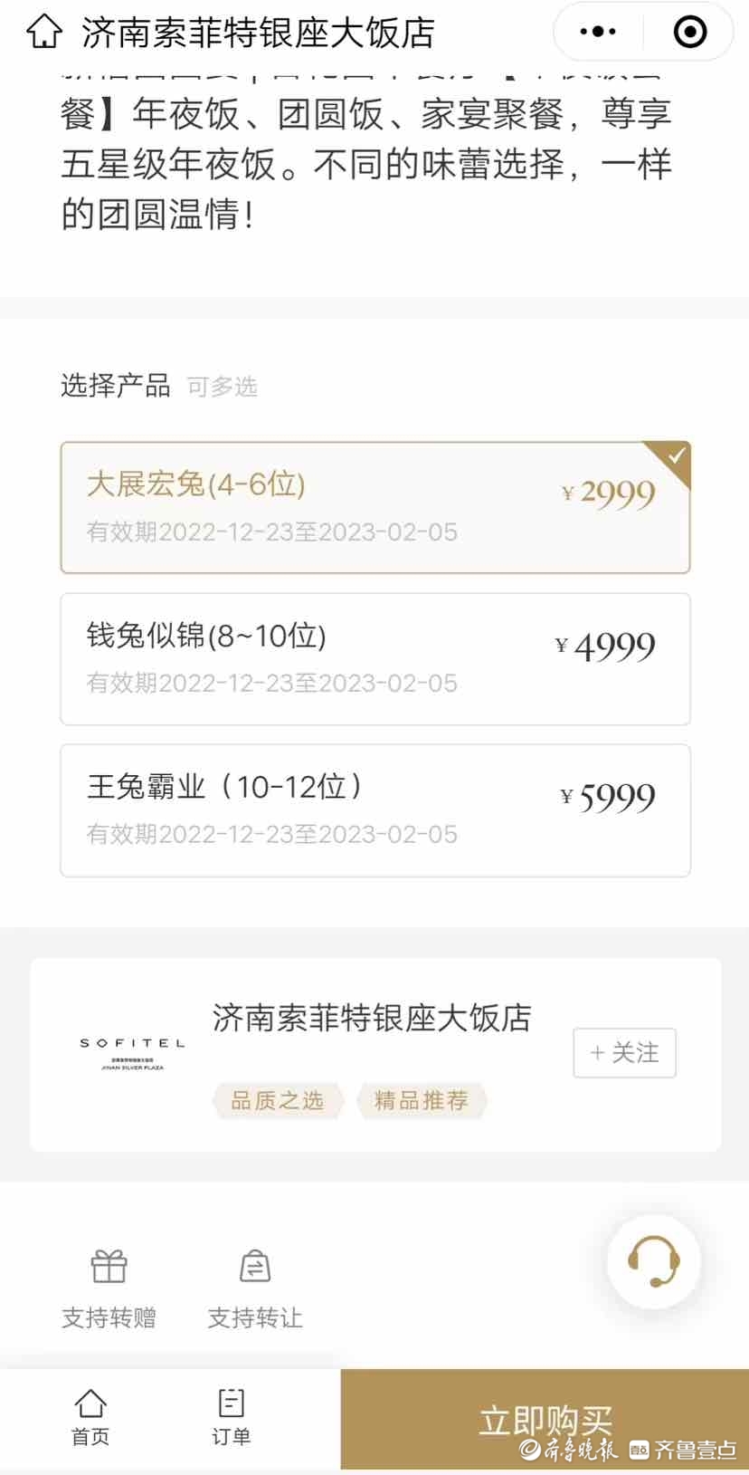 索菲特银座大饭店推出了三种年夜饭套餐,分别是4-6位2999元的“大展宏兔套餐”、8-10位4999元的“钱兔似锦套餐”以及10-12位5999元的“玉兔霸业套餐”。三份套餐的有效期是2022年12月23日至2023年2月5日。据了解,顾客在相关的微信小程序上购买套餐,如果退款,会有大约一百元的手续费。