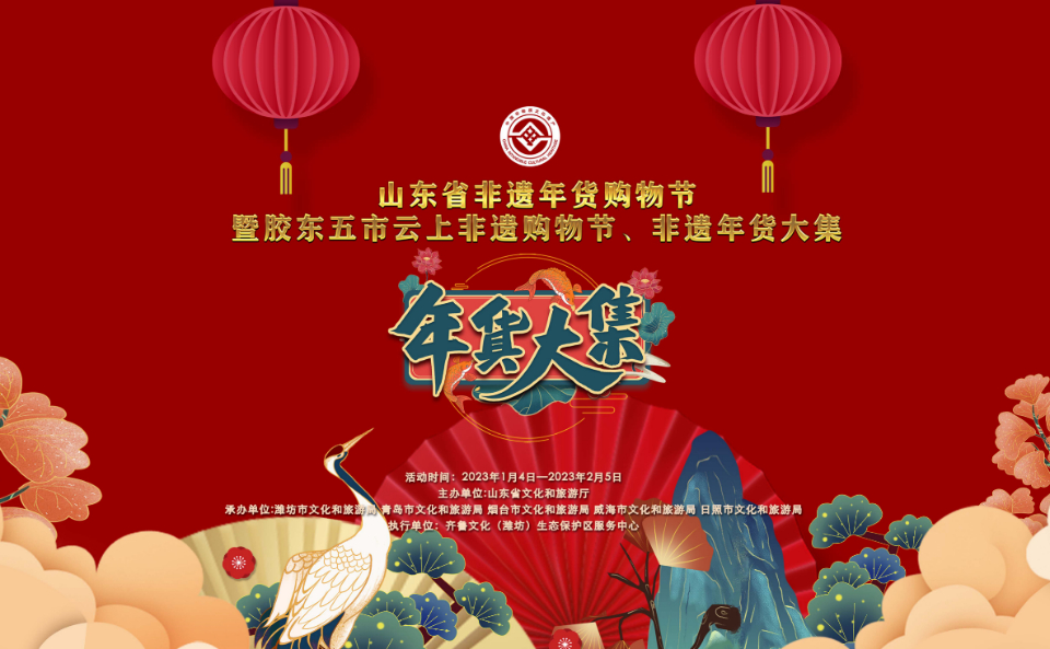 为贯彻落实党的二十大精神,弘扬中华优秀传统文化, 更好满足人民群众多样化、多层次的春节文旅消费需求,经过积极筹备,山东省文化和旅游厅将于2023年山东省非物质文化遗产月期间,在潍坊市齐鲁文化(潍坊)生态保护区综合传承教育实践基地举办山东省非遗年货购物节暨胶东五市云上非遗购物节、非遗年货大集系列活动。届时,将为广大群众献上一场非遗年味盛宴,让大家在春节期间可以赏非遗、购非遗、品非遗。