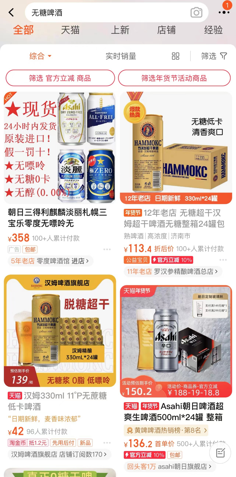 而近年来,随着啤酒消费趋于高端化、多元化,无糖酒水市场热度渐升,除莱茵生物之外,日本麒麟、贝瑞甜心、十点一刻、空卡等品牌也推出了一系列各有千秋的无糖啤酒,但它们的售价均比常规啤酒贵出不少。从微店、淘宝等平台的销售数据来看,80元6瓶的莱茵零界总销量为518,126元一箱的汉姆无糖精酿月销量为300+,而卖358元一箱的日本麒麟月销量仅为89,其余无糖啤酒品牌的销量则大多小于50。对于无糖啤酒,很多人可能只是尝个鲜,远未成为家中常备的“口粮酒”。