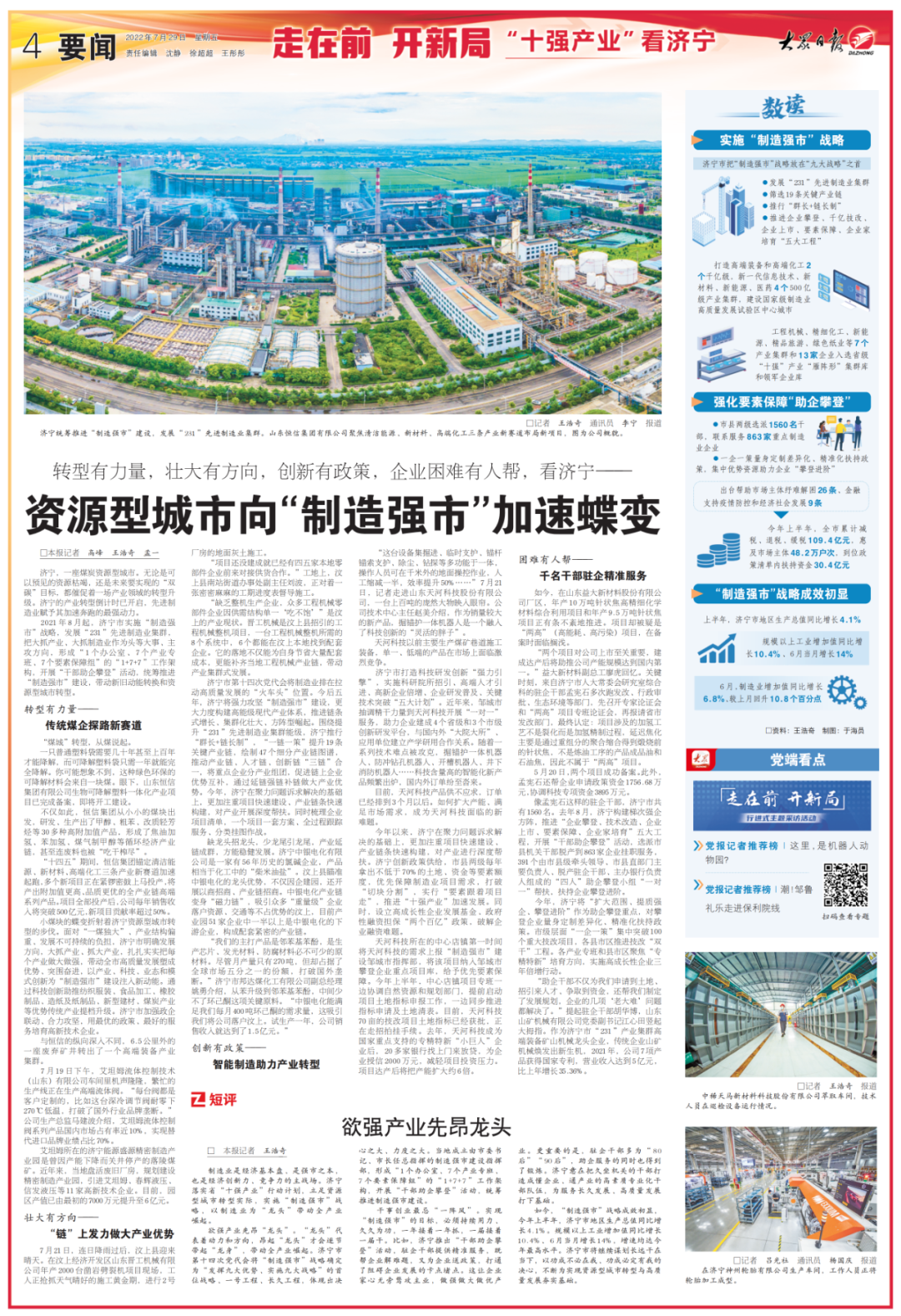 2022年5月24日,《大众日报》头版头条文章《聚焦“制造强市” 推动城市转型》详解了济宁“干部助企攀登”活动——聚焦“231”先进制造业集群,扩增攀登企业863家;1560名干部下沉企业,挂图作战30个重点项目;19条核心产业链延链补链,优选160家高成长企业梯度培育;设立高成长性企业基金,80条政策要素保障措施……