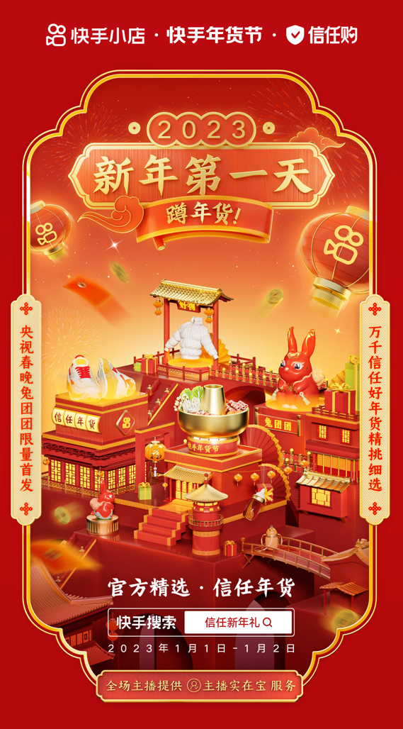 1月1日-1月2日,快手小店举办“信任好年货”新年专场活动,与新入驻快手的CCTV中视购物合作打造2023春节联欢年货节直播,并在快手电商独家首发2023年央视春晚总台文创“兔团团”生肖形象。活动引发广泛关注和讨论,全网话题相关视频累计播放量超过1亿,活动期间中视购物频道官方快手账号粉丝量增长达3698%,参与专场的主播累计GMV达4798万,直播被观看7733万次,众多信任主播登上快手卖货榜实时第1名。