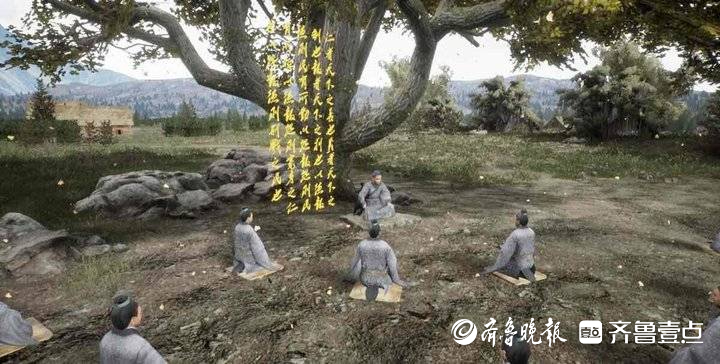 在“科技与艺术”板块,首先映入眼帘的是有一件名为《金声玉振》的作品,它是利用三维虚拟仿真CAVE显示平台的呈现,借助专属眼镜,先进的科技和古老的文化结合打造的沉浸式体验场景。戴上眼镜,便可以穿越时空回到春秋时期,听孔子在杏坛讲学,学习和感悟儒家文化。